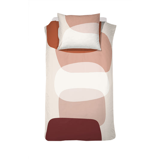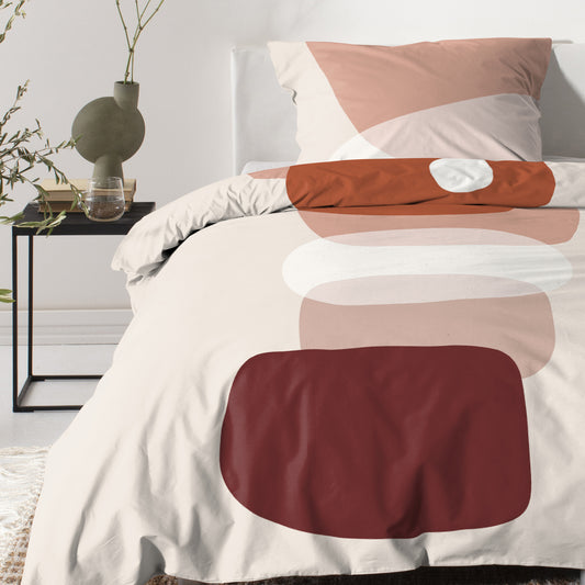 Het Cinderella dekbedovertrek Kiezel is perfect voor liefhebbers van natuurlijke tinten. De zachte kleuren zoals beige en zand worden prachtig gecombineerd met accenten van oranje en bordeaux. De ronde vormen zorgen voor een rustige, harmonieuze uitstraling in je slaapkamer.